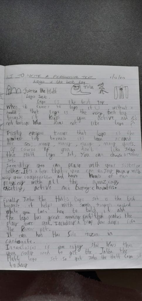 Persuasive writing Persuasive writing April 3, 2020 R Gale Chestnut class had various tasks set this week based on persuasive writing. I have been impressed by the ones I have read so far. Categories:Chestnuts activities, News