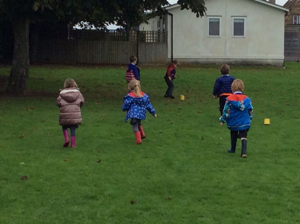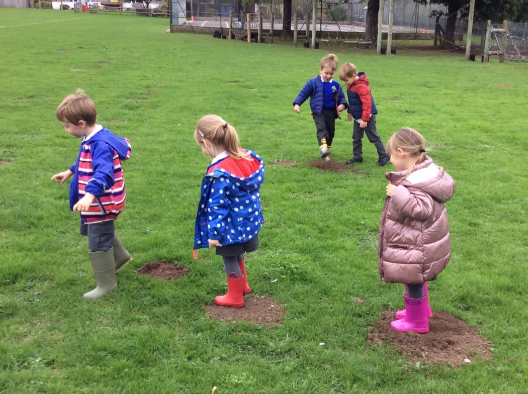 Everyday we put our welly boots on and go for a walk around the playing field during afternoon play. Today we found lots of  mole hills so we played  ‘going on a mole hunt’. We found some Conker she and had a running race.