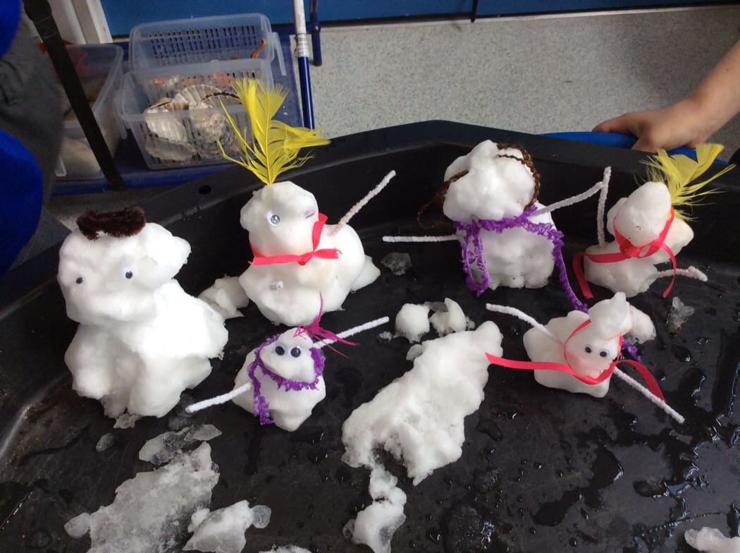 Conker Class collected some snow on our walk and took it indoors. We used it to make a snow family. We all put our snow person in a different place to find out which one would melt first. We used the minute timer to record how long it took for each one to melt. No one wanted to put their snow person by the heater as they didn’t want them to melt. We could remember what happened to our ice sculptures.