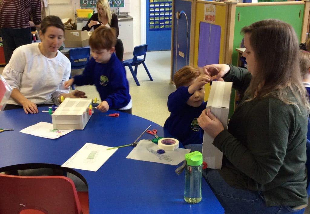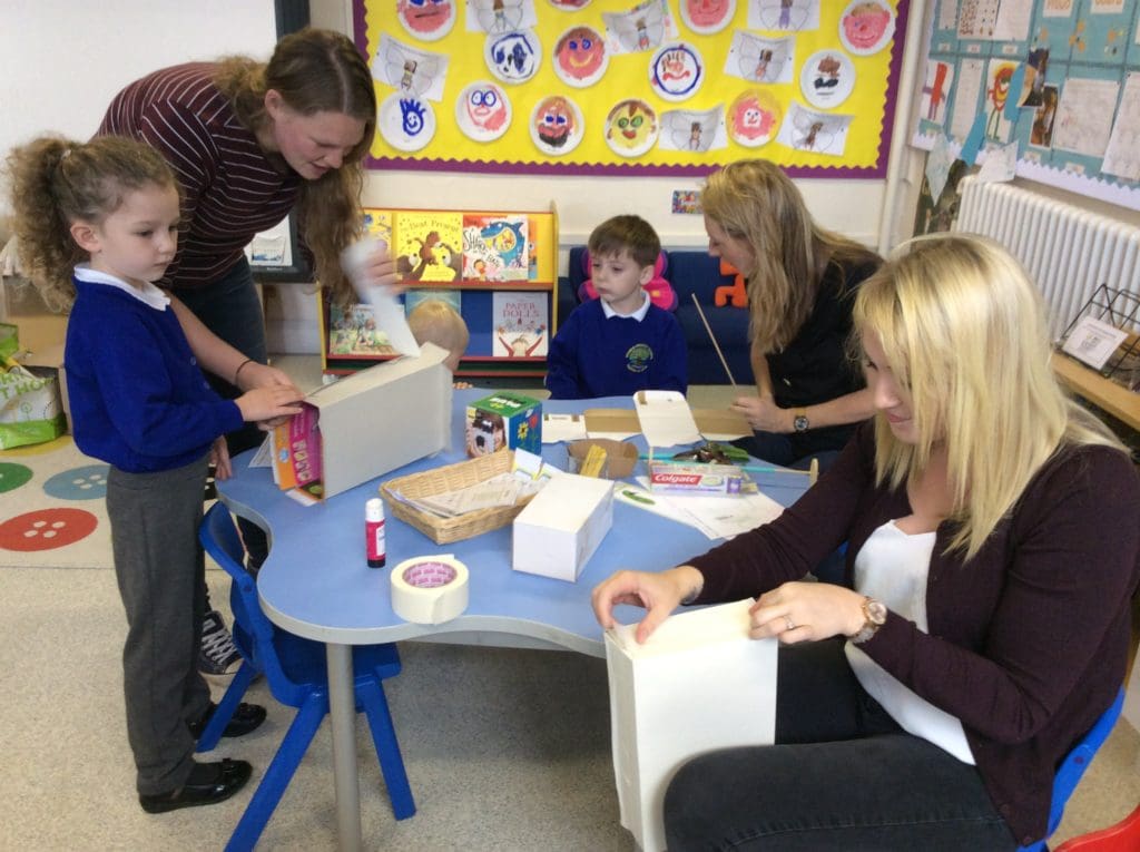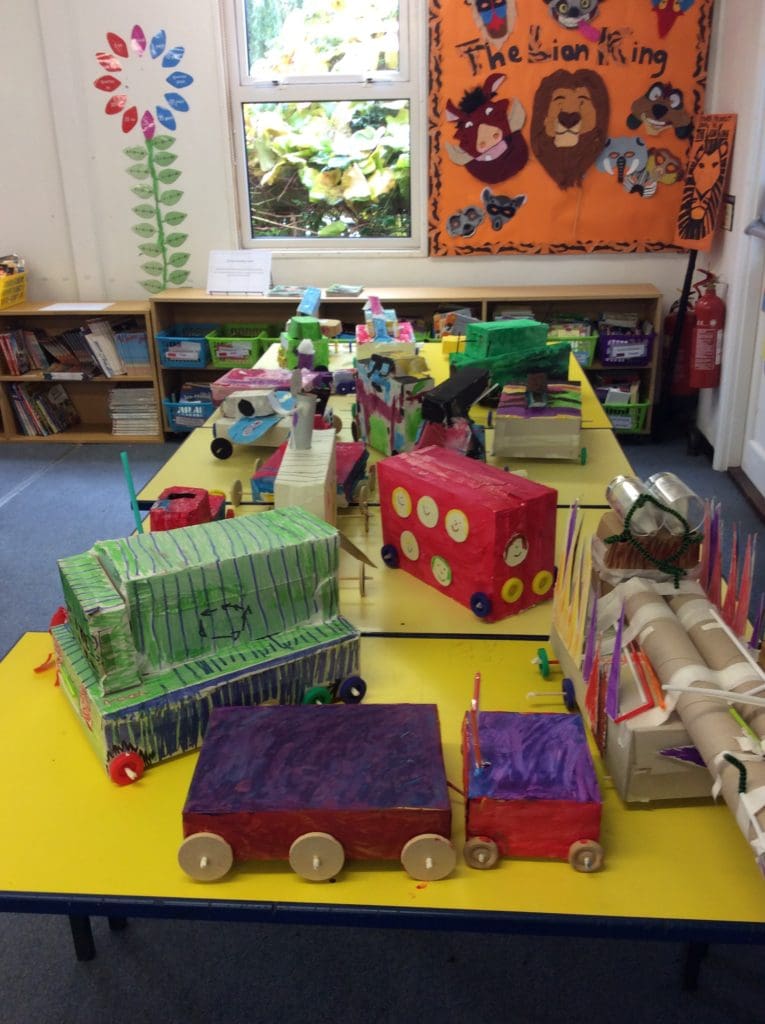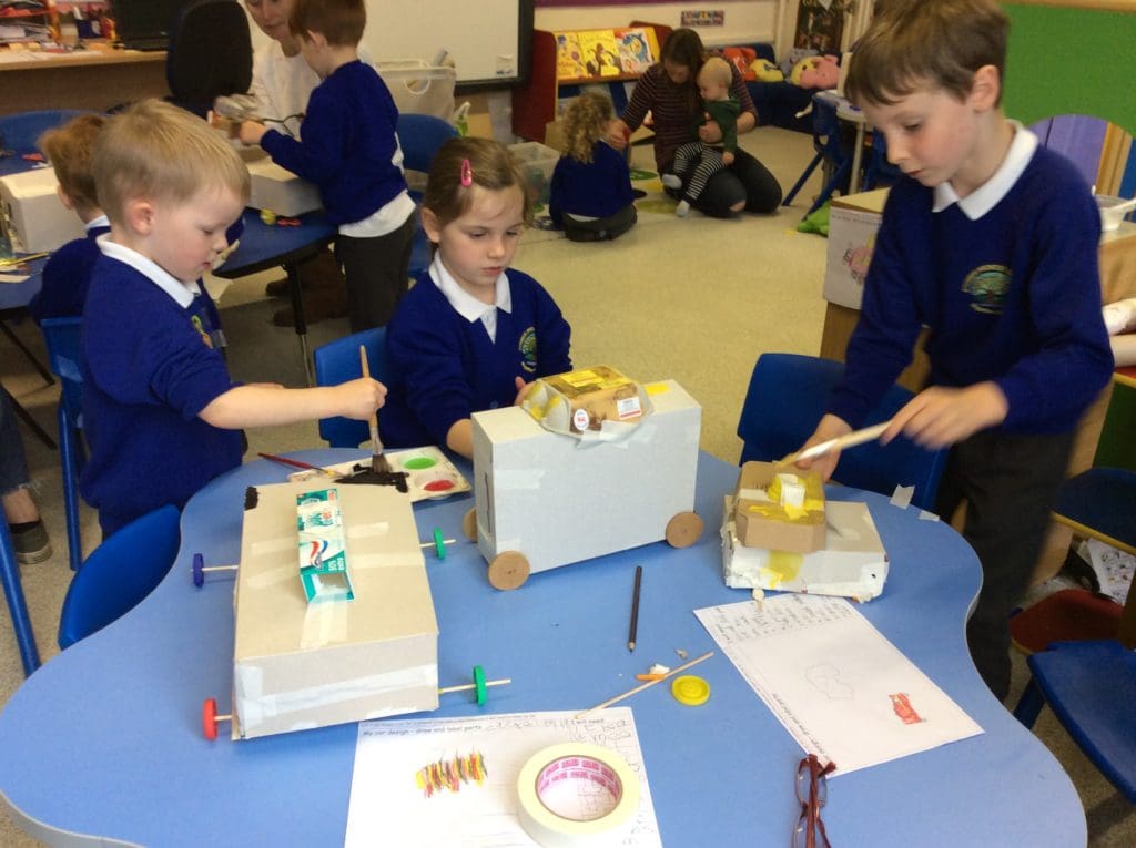 We had super fun in Hazel class this morning with the help of some parents and carers. The children used their vehicle designs to help them to make a moving vehicle using cardboard boxes. There were some great ideas from tanks to alien cars. The adults helped to add extra sparks of imagination too. The end results were amazing, the children (and adults) were super proud of their creations!